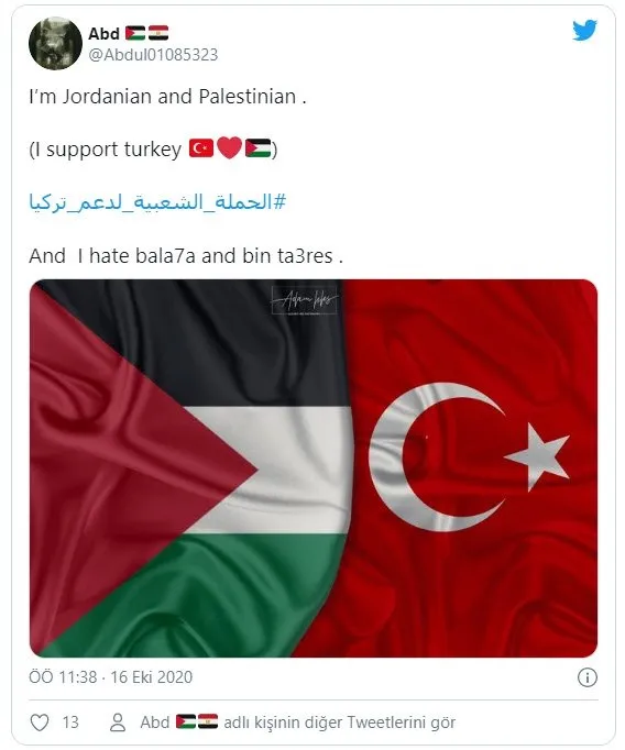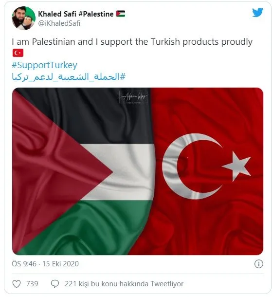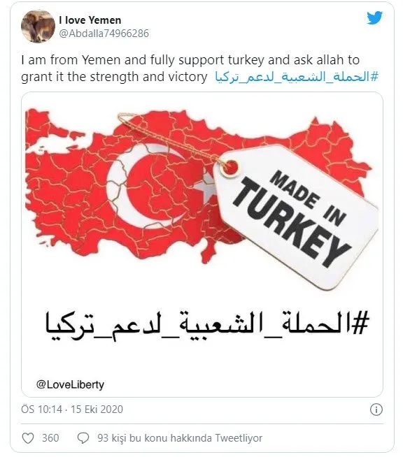 Sosyal medya kullanıcılarının Twitter üzerinden paylaştıkları mesajlarda “Yemenliyim ve Türkiye’yi destekliyorum. Allah’a güç ve zafer vermesi için dua ediyorum”, “Filistinliyim ve gururla Türk mallarını destekliyorum”, “Ürdünlüyüm ve Türkiye’yi destekliyorum” ifadeleri paylaşıldı. Kullanıcılar “Türkiye’ye destek” etiketiyle binlerce tweet paylaştı.